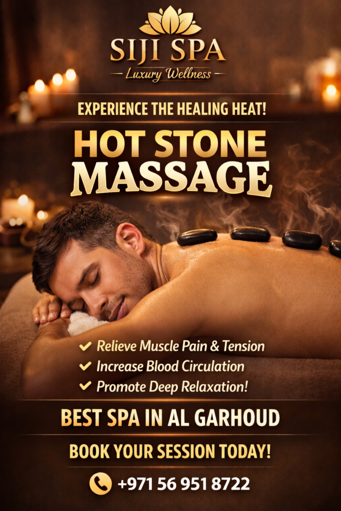 Our hot oil massage in Al Garhoud uses heated stones to relax deep muscles, improve blood flow, and reduce tension. Perfect for full-body relaxation.